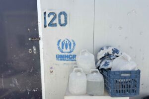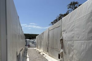 De wind is er al voor de dag begint. Binnen in de krappe tenten en containers van het kamp Mavrovouni blijft het geruis overheersen. Het is hier nooit stil. Witte rijen containeronderkomens, met daartussenin waslijnen behangen met wapperende kleren in allerlei kleuren, vormen en maten, verschaffen onderdak aan een diverse groep mensen, vooral uit landen als Afghanistan, Soedan, Jemen, Somalië, Eritrea en Palestina. De 1000 huidige bewoners van het Mavrovouni kamp op Lesbos wachten hier op de beslissing over een verder verblijf in Europa.