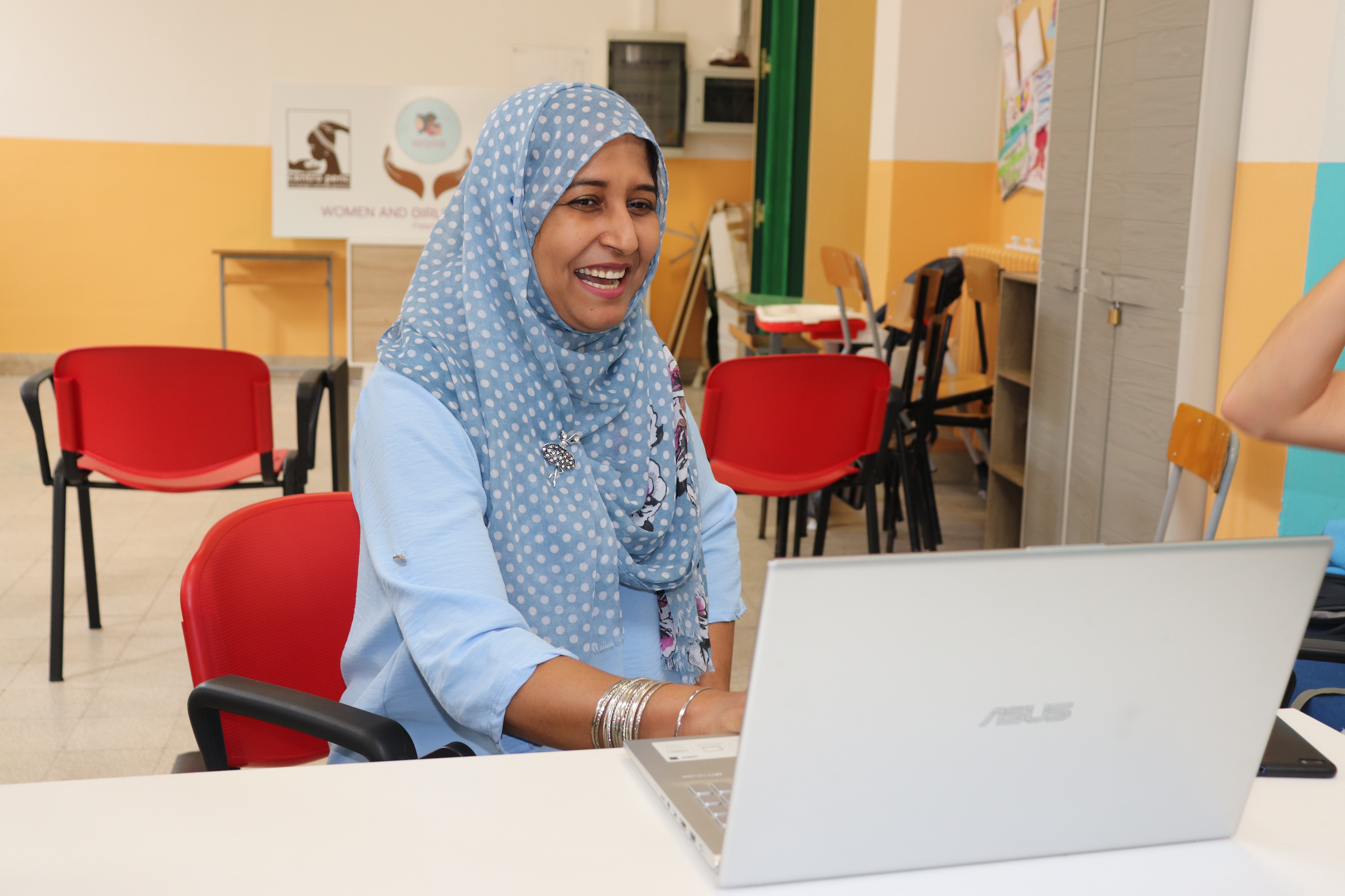 In Palermo, she gets in contact with Maria Chiara Monti, and joins Centro Pencs community. “Maria asked me if I wanted to give the women computer science classes.” In this class, Akther shares her experiences. “It is not just a computer course. It is a way to find strength, to take back your own life and do something for yourself.” She still works in secret, she tells us, because her husband does not like it when she works a lot. “I will not let it stop me. Every day, we step a bit further. Women sacrifice everything. For their kids, for their family. I want to help these women to step up. They can use the information I give them for themselves. Like a job application. They like doing it and they make it work.”