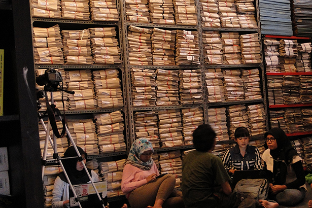 De hoge muren in het interieur van het hoofdkwartier van Indonesia Buku worden grotendeels aan het zicht ontrokken door enorme kasten. Honderdduizenden kranten zijn tot pakketten gebonden met rood lint en duidelijk gemarkeerd. Elke centimeter die niet in beslag wordt genomen door de kranten, is gevuld met stapels grote blauwe archiefmappen. Overal staan dozen met boeken. Gus Muh glundert. “Hier kun je alles vinden wat over Yogyakarta wordt geschreven: elk boek, elk krantenartikel. Als iemand zich afvraagt wat de Sultan van Yogya uitspookte op 12 november 1973, kan hij het hier komen opzoeken.” De nieuwste aanwinst is een Duitse drukpers, gekocht met donaties van sympatisanten. “Nu kan iedereen zijn of haar eigen boek laten drukken. Het maakt niet uit wat het onderwerp is en hoe het is geschreven. Voor driehonderdduizend roepiah [ongeveer 20 euro] heb je jouw eigen boek, professioneel gedrukt en met een harde kaft. En natuurlijk stoppen we dat boek ook in ons archief, en als het goed genoeg is, helpen we om het in een grotere oplage uitgegeven te krijgen.”
