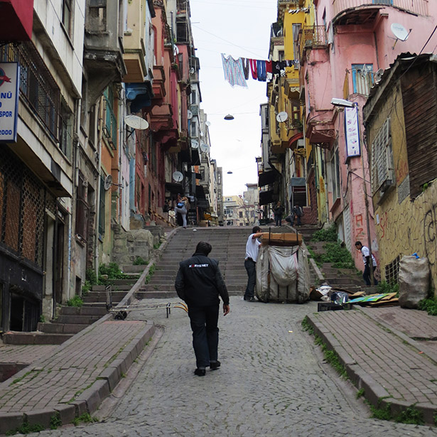 Op de traptreden langs de weg zijn jonge mannen bezig met het lassen, zagen of anderszins bewerken van allerlei materialen. Er is overal bedrijvigheid en toch hangt er een sfeer van rust. Hier en daar vind je een toeristisch gezicht of een hotel in het straatbeeld. Het gewone Turkse leven gaat hier zijn gang. Naast de ontelbare kebabzaakjes en andere eetgelegenheden zitten overal kleine werkplaatsen, kleding- en schoenenwinkels of groente- en fruitstalletjes. Onderbroken door halve ruïnes en ruime theehuizen waar de mannen een krantje lezen of kaart spelen, geeft de wijk een armoedige, maar tegelijkertijd energieke sfeer. Dit lijkt het echte Istanboel te zijn.