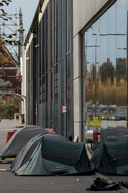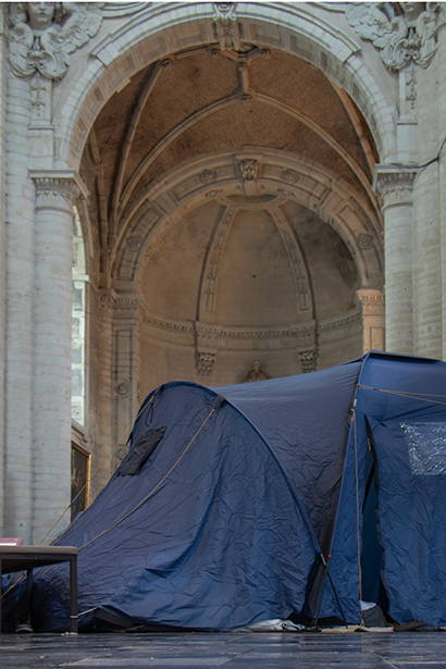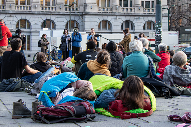 Achter het Justitiepaleis in Brussel komen demonstranten het plein oplopen en rollen er kleurrijke slaapzakken uit. De vroege ochtendzon verlicht het tafereel. Iets later liggen zo’n zeventig Brusselaars naast elkaar op de koude grond. “Geen mensen op straat”, staat er op een spandoek.