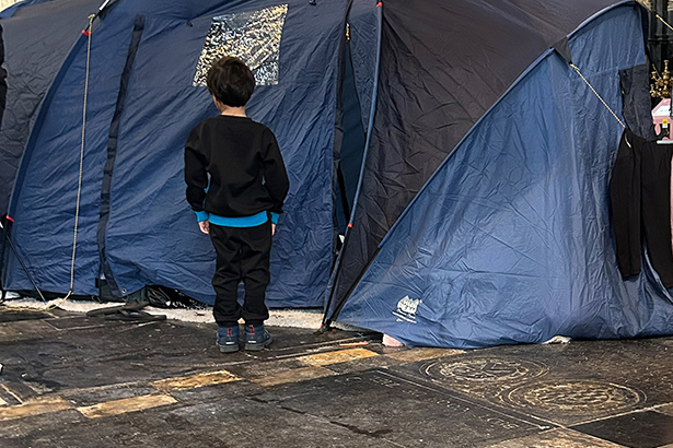 “Meer dan 1.800 mensen die bescherming zoeken slapen vandaag letterlijk op straat. Zelfs gezinnen met kinderen worden door de overheid in de kou gezet”, scandeert Eva Davidova door de megafoon.