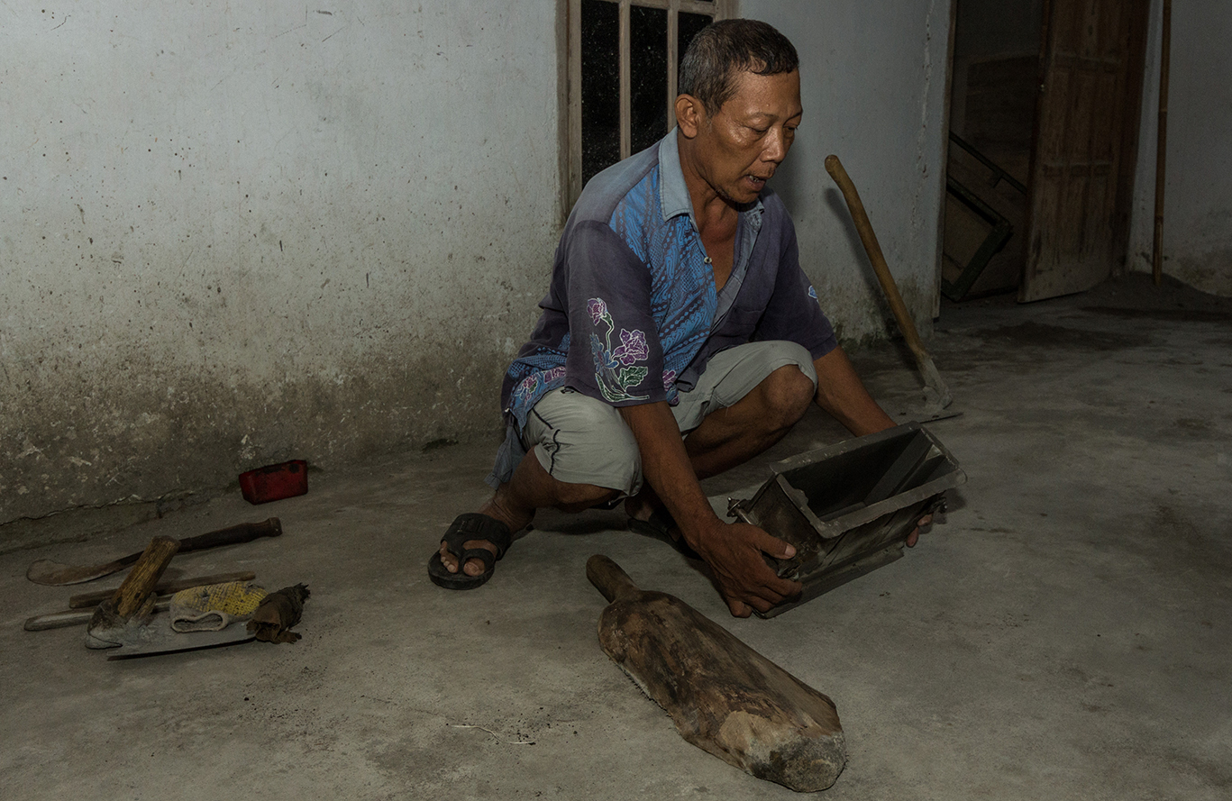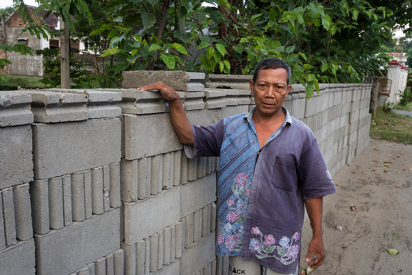 Voor zijn huis zit Subatin, een vader van zes kinderen. Hij heeft jaren in de bouw gewerkt. Veel gebouwen in de stad Surabaya komen van zijn hand. Toch koos hij ervoor om thuis te gaan werken. “Ik was het zat in de grote stad. Ons huis stond op instorten en daar moest iets aan gedaan worden. We hadden niet heel veel geld voor het materiaal, dus bedacht ik om zelf de stenen te gaan maken.”