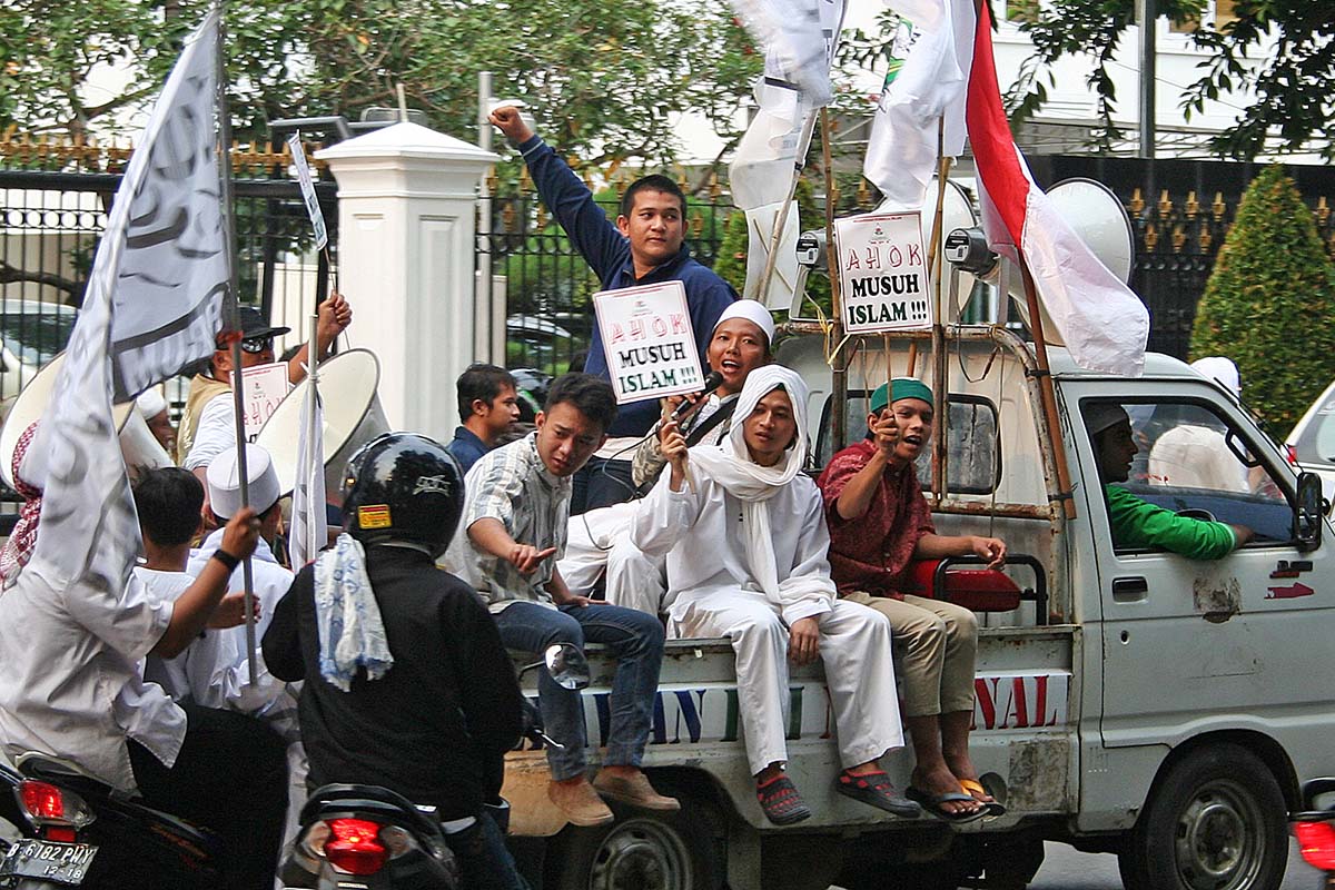 De Indonesisch radicale knokploeg demonstreert tegen Ahok