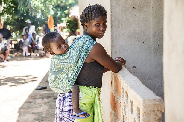In het dorpje Pitala in het noorden van Malawi hangt een jongetje op de rug van zijn moeder.