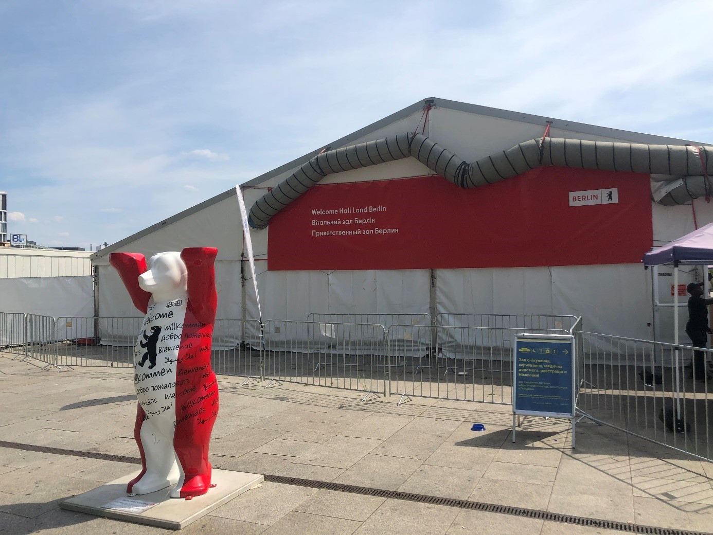 The Gates are Closing 3: Deze roodwitte beer verwelkomt vluchtelingen die op Berlin Hauptbahnhof aankomen. Naast de ingang van de welkomsthal staat een bord met de tekst "Only for refugees from Ukraine!"