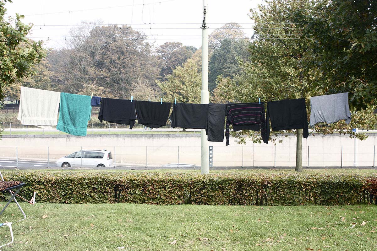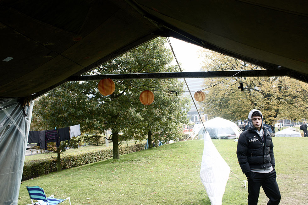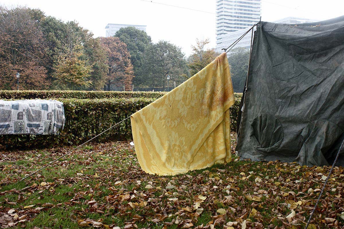 Zomaar een vredige herfstdag in Den Haag; er staat geen zuchtje wind en de zon schijnt. Op het Malieveld hangen kleden vol patronen en kleuren aan draden naast tenten. Hier kampeert een grote groep Iraakse mannen. Een kleine vijftig Irakezen...