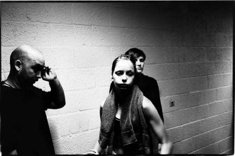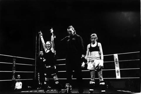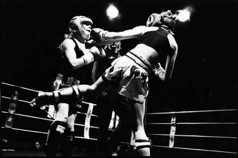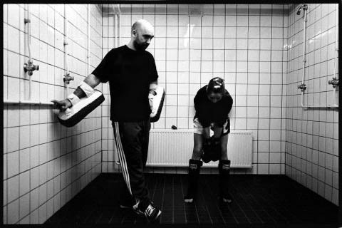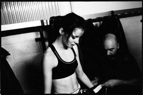 De dertienjarige Belgische Lisa Buyle (midden) staat samen met haar trainer en een vriendin wat te kletsen bij de ingang van de Beijneshal in Haarlem. Over een uur vindt hier de eerste editie van Haarlem Fight Night plaats. Dit is...