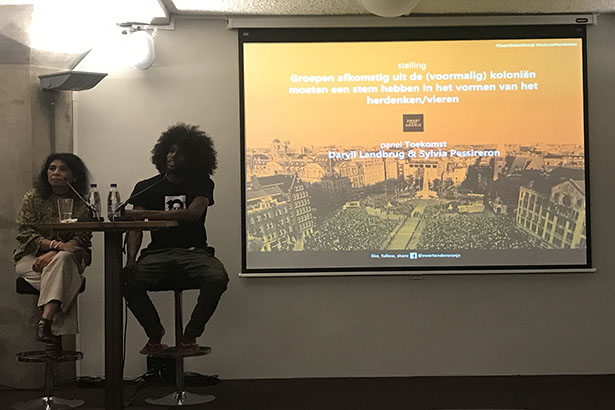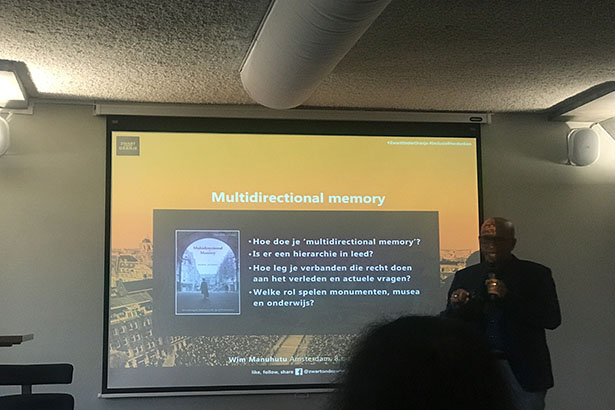 De eerste spreker is Wim Manuhutu, historicus en actief op het gebied van erfgoed, cultuur en diversiteit. Manuhutu heeft het over de koloniale ‘’hang-over’’. Zo zijn een van de instrumenten van het kolonialisme ‘’verdeel en heers’’ en het instrument tegen de strijd hiervan is solidariteit. ‘’Solidariteit wordt gevreesd door koloniale overheden omdat dit een krachtig wapen is tegen kolonialisme’’. Maar ook solidariteit heeft zijn grenzen. ‘’Mensen moeten ruimten scheppen en vragen stellen. Hierbij zijn onder andere monumenten en het onderwijs erg belangrijk’’. Het ruimte scheppen begint volgens Manuhutu bij de dominante groep, de witte Nederlander.