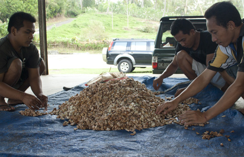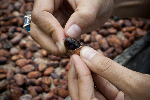 Op het erf wordt net een verse lading cacaobonen binnengebracht. De slijmerige witte massa doet in niets aan chocolade denken. “Dat verandert in het fermentatieproces”, zegt Ningsih. “Het witte vruchtvlees verdwijnt dan, en aan het einde van het proces blijft er een donkerpaarse gebarsten boon over.” Op grote houten tafels liggen de bonen van een paar dagen geleden in de zon te fermenteren, onder een laag van bananenbladeren en jute zakken. De boer staat er glunderend naast. Bij iedere tafel pelt hij een cacaoboon open om te laten zien hoe ver het fermentatieproces gevorderd is.