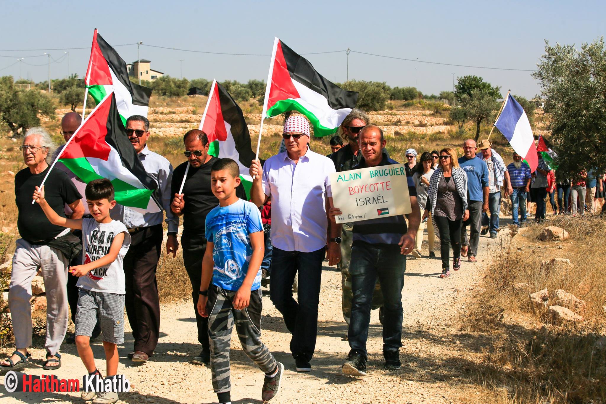 De menigte is elke vrijdag anders. Deze week is er een Franse delegatie, afkomstig uit het stadje Vendre, dichtbij Montpellier. Ze zijn voor een week naar Bil’In gekomen om een verbinding aan te gaan met de Palestijnse bewoners. De lokale fotograaf, Haitham Khatib, is al een keer op bezoek geweest in Vendre en heeft zijn foto’s vertoond. “Frankrijk was vroeger een goede steun voor de Palestijnen. Onze huidige regering heeft een andere mening, maar wij gaan ermee verder”, zegt een van de Franse bewoners. Sommigen zijn al jaren aanwezig bij deze protesten. Haitham Khatib documenteert ze bijna allemaal.