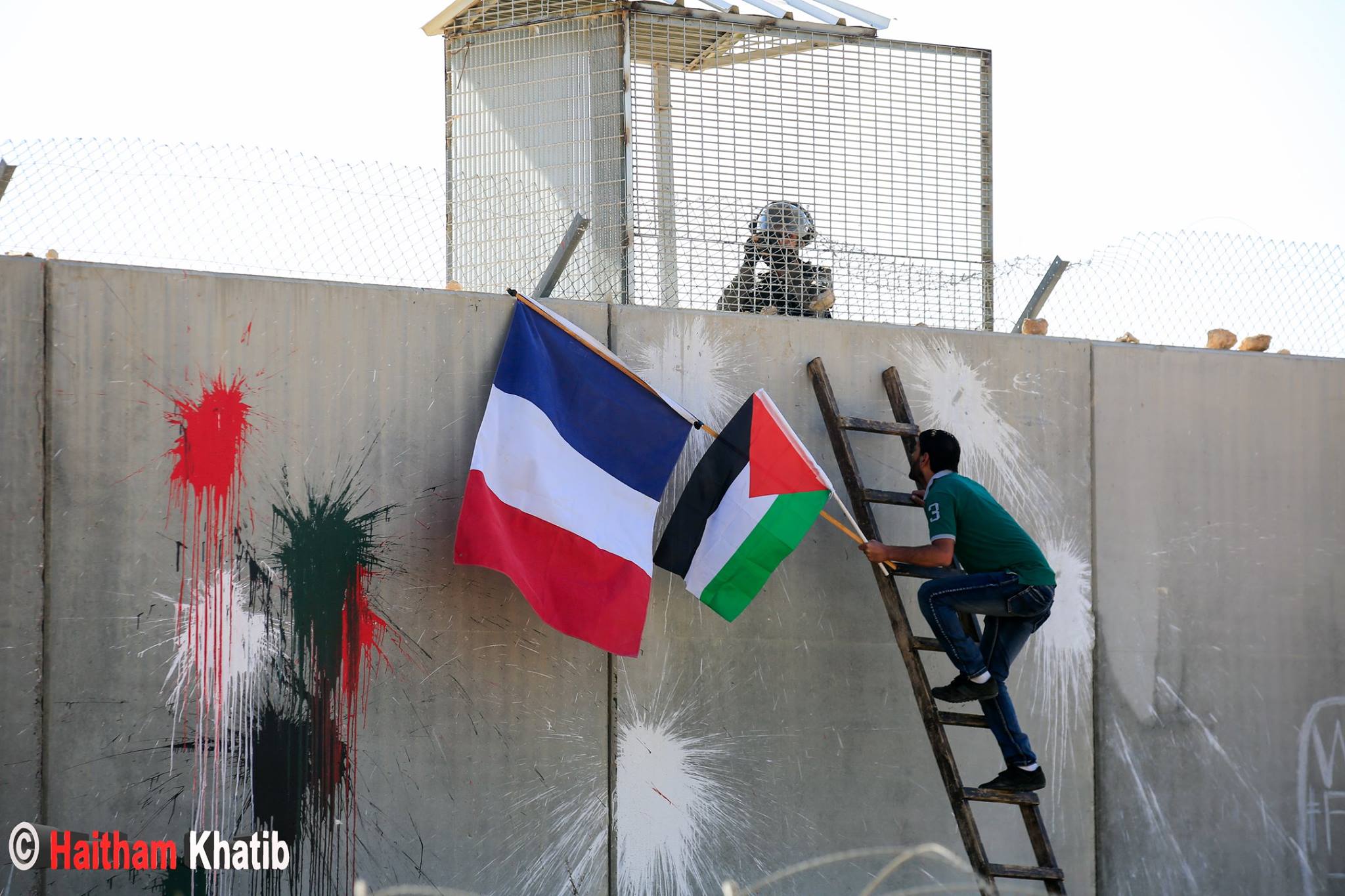 Het is twee uur in de middag. Een kleine menigte heeft zich verzameld onder de schaduw van de enkele bomen in het gebied bij Bil'ln in Palestina. Mannen en vrouwen, jong en oud, Palestijns en Frans. Het is vrijdagmiddag en het is tijd voor de wekelijkse protesten. De menigte begint zich langzaam in de hitte te bewegen. “Free, free Palestine”, wordt er gescandeerd, terwijl ze de muur naderen. Franse en Palestijnse vlaggen steken hoog in de lucht. Een Israelische man roept leuzen in het Hebreeuws. “Ik wil dat het bij ze aankomt”, zegt hij.