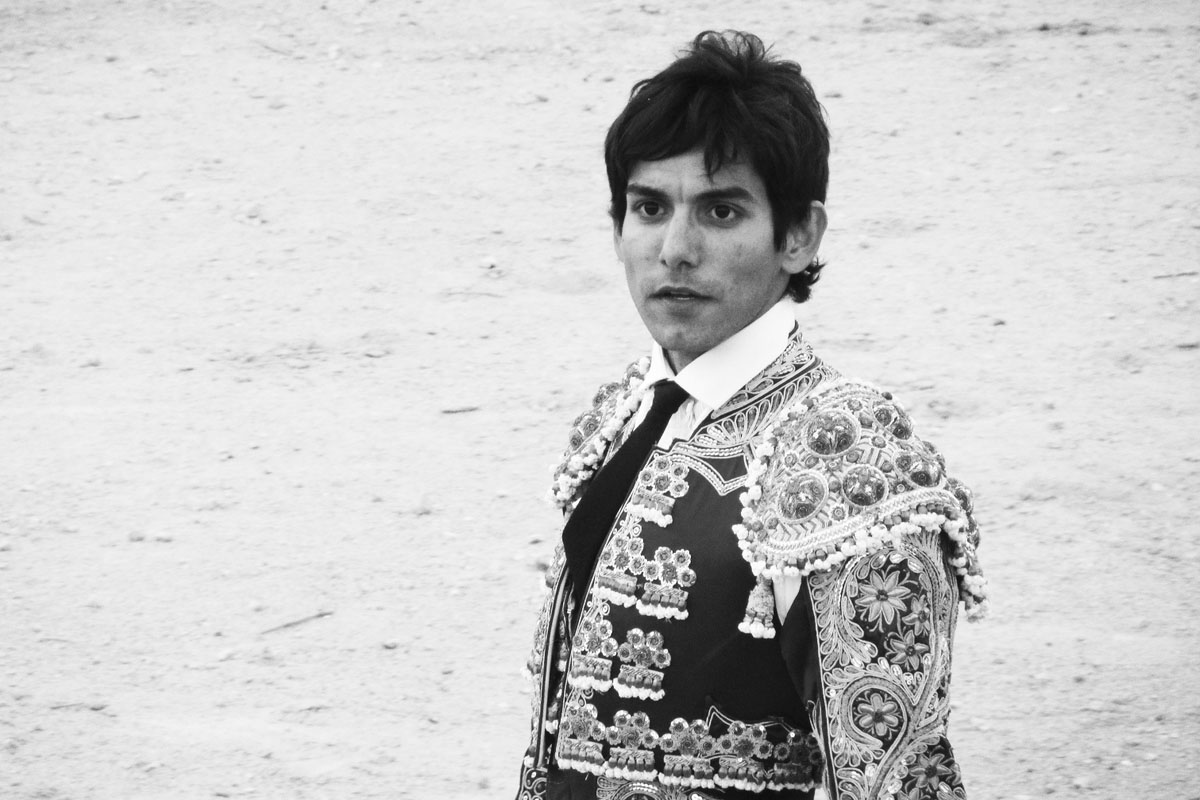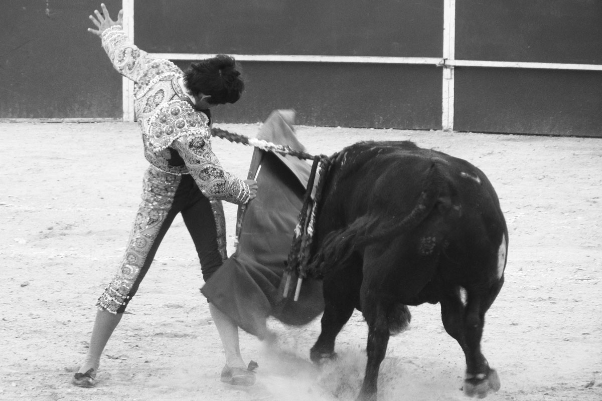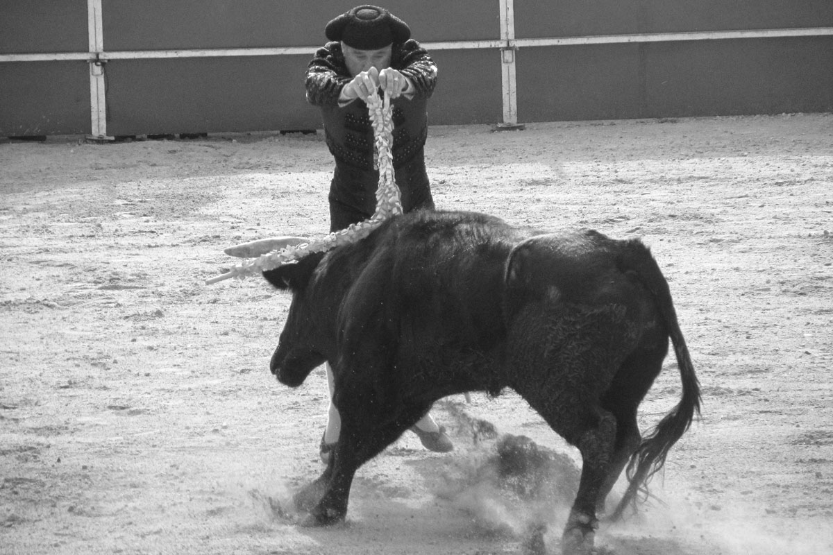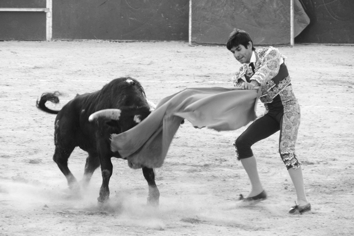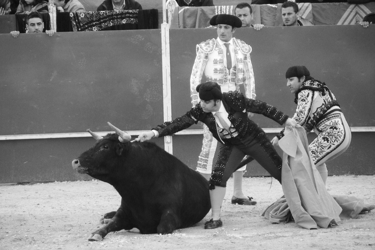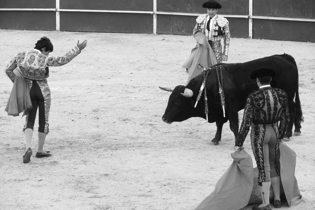 Jonge stieren bevechten jonge, in de leer zijnde matadoren