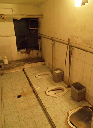 Buiten de kamer van Zhao Guannan dient de weeïge en scherpe stank zich weer aan. De kelderbewoners hebben weliswaar toegang tot gemeenschappelijke sanitaire voorzieningen, de staat ervan is een ander verhaal. Omdat niemand de verantwoordelijkheid heeft of neemt om schoon te maken, gebeurt dat ook niet, met alle gevolgen van dien. De toiletten en de enkele douche voor de ongeveer twaalf huishoudens zijn extreem smerig. Voor een frisse neus moet je naar boven.