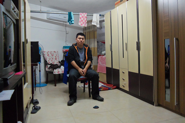 In de gang onder de grond klinken verderop de geluiden van een actiefilm. Een paar passen verder en voorbij de sanitaire voorzieningen hangt een gordijntje. Hier achter ligt een dikkige man van in de twintig in zijn bed een film te kijken op zijn laptop. Na te zijn aangesproken duurt het een tijdje voor hij naar buiten komt. Slaperig sloft hij naar buiten. “Ik werk bij een bedrijf dat handelt in bouwmaterialen. Het is hier vlakbij gevestigd, dat is erg handig. Ik betaal maar 500 Yuan (zo’n 60 euro) per maand voor deze ruimte en heb niks te klagen.” Zijn baan is de reden dat hij hier nu leeft. Zijn vrouw en kinderen wonen nog steeds in het Noordoosten van China. “Ik mis ze ontzettend maar zal ze nooit hier laten wonen. Ikzelf vind het prima, ik heb hier alles wat ik nodig heb maar voor kinderen is het niet geschikt. Ik weet dat sommigen hier met hun kind wonen, maar ik vind dat niet kunnen. Kinderen zouden niet onder de grond moeten opgroeien.”