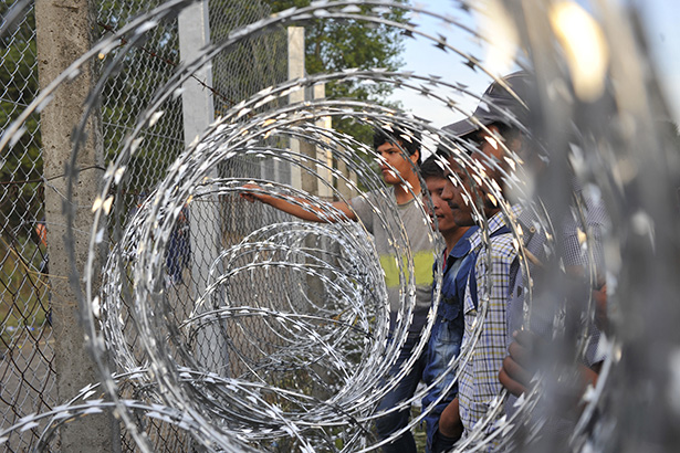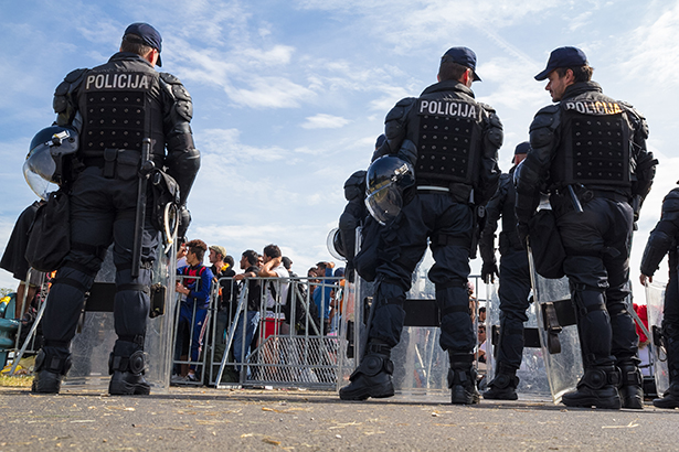 Policemen behind the barrier dividing group of immigrants and refugees from Middle East and North Africa at Harmica, state border between Slovenia and Croatia, 2015. Source: Shutterstock.