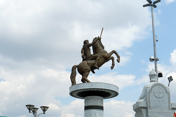 Op het Plostad Makedonijaplein staan wel twintig standbeelden van historische helden. De standbeelden vallen echter in het niet bij het vijftien meter hoge beeld van Alexander de Grote, midden op het plein. Het steigerende paard en zijn beroemde berijder staan op een kolom van tien meter hoog. Alexander houdt zijn zwaard in alle heroïek op de denkbeeldige vijand gericht. Aan de voet staan zijn soldaten in volle wapenuitrusting: met zwaard, speer en schild. Vanuit de omringende vijver voeren tientallen fonteinen een waterballet op. En rond de vijver staat nog eens een handvol indrukwekkend grote leeuwen, waarbij Skopjes eigen Arc de Triomphe prijkt: de ‘Porta Macedonia’.