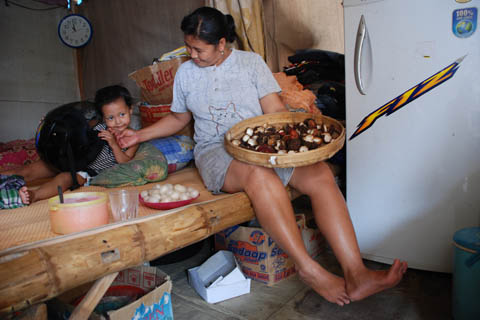 Naast het moddermeer hebben honderden bewoners van de ondergelopen dorpen onderdak gevonden op een groot overdekt marktcomplex. Bewoner Suprapti Ningsih vertelt over haar leefomstandigheden: “Het kan behoorlijk koud worden ’s avonds en er zijn veel muggen, overdag is het erg warm hier.” Met haar twee kinderen, man en moeder woont ze in een klein hutje bestaande uit houten planken en lappen stof. In de hut staan twee bedden, een koelkast en een klein tafeltje.