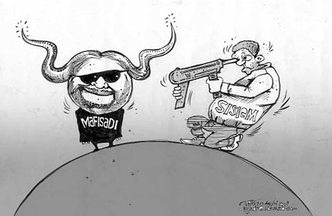 Ik maak redactionele cartoons, maar heb eigenlijk een hekel aan tekenen over politiek. Want de politiek is de nieuwsorganisatie binnengedrongen. Als ik een politieke cartoon, getekend vanuit mijn eigen optiek, aflever aan de redactie, wordt die simpelweg geweigerd. Zonder uitleg. Daarom beperk ik me het liefst tot maatschappelijke kwesties. Een van mijn cartoons die de meeste maatschappelijke beroering bracht, is die van een hoogzwangere Maasai-vrouw. Ze zit op een kruispunt, met in de ene hand een bord dat wijst naar een begraafplaats en in de andere een bord dat wijst naar een ziekenhuis. Ik wilde de lagere klasse ermee beroeren. Dat is gelukt.