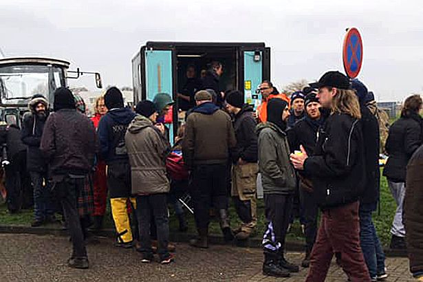 Naarmate het middag wordt is het steeds drukker op het terrein. Medestanders van de ADM-ers komen om hun steun te betuigen. Rond het middaguur stopt er een ‘Soup-Truck’ met vrijwilligers die de bewoners voorzien van eten en drinken. Ondertussen zijn de politie en de beveiligers druk bezig de laatste volhardende bewoners van het terrein af te krijgen. Dat gaat niet zomaar. Het ADM terrein is twee keer uitgeroepen tot cultureel erfgoed door de Verenigde Naties. Volgens ADM-bewoner Daan wordt er een vies spelletje gespeeld door de gemeente: “De VN heeft aangegeven dat er mensenrechten geschonden worden en met een spoedvoorzieningsaanvraag willen ze dit tegengaan. Toch wordt er door de gemeente het label op ons geplakt van illegale krakers. Zodat het terrein nu weer in handen komt van de erfgenamen van de in 1997 geliquideerde vastgoedcrimineel Bertus Luske.” Er klinken meerdere geluiden vanuit de bewoners waarin zij de gemeente van Amsterdam en de politie ervan betichten onder een hoedje te spelen met de erfgenamen van Luske. Even verderop rijdt er een erfgenaam van Luske in een dure auto langs de oud-bewoners. Direct ontstaat er een klein opstootje. Boze ADM-ers bonken op de ramen van de auto en er ontstaat wat duw- en trekwerk met politie-agenten die het proberen te sussen. Dit lukt ook na enkele minuten, waarna de auto rustig doorrijdt.