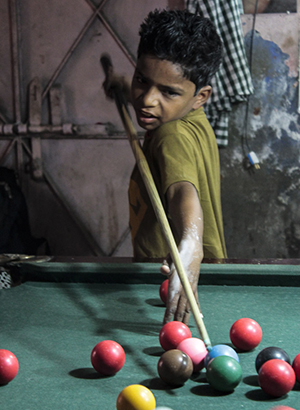 Plotseling valt de elektriciteit uit. Roshan kijkt omhoog. De ventilator neemt in snelheid af en hij voelt nog maar een klein zuchtje wind bij elke omwenteling. Binnen enkele seconden stopt de ventilator helemaal en neemt de hitte het over. Onaangedaan gaan zijn broertje en zusje verder met spelen, gewend als ze zijn aan deze dagelijks voorkomende pauzes. Roshan tovert wat waaiers tevoorschijn. Terwijl hij kijkt naar het spelletje pool, betrekt, voor zover dat mogelijk is, zijn gezicht een beetje. Een ruimte als deze is ook goed voor de kinderen vertelt hij. Buitenspelen is onveilig. Het broertje van Roshan, Samir is met zijn twaalf jaar oud al een kampioen. Hij poolt wanneer de tafel niet bezet is, zo’n zeven a acht keer per dag. Toch speelt hij eigenlijk liever cricket. Om de hoek ligt een klein stukje braakliggend terrein. De jongens spelen er tussen het afval. De bal belandt vaak in het riool. Soms krijgen ze ruzie. Samir laat een litteken zien, vlak naast zijn oog. Vorig jaar gooide iemand tegels uit het raam, net toen hij langs rende. In het poolcafé kan hij daarentegen altijd spelen en voelt hij zich veilig. Op de vraag waar hij het meest bang voor is, gebaart Samir voorzichtig naar zijn broer.