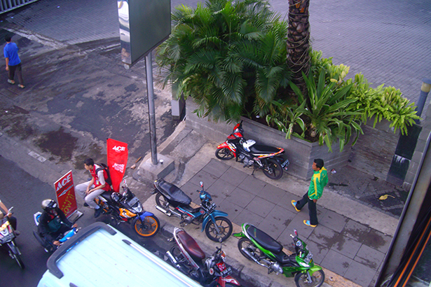 Er zijn in Jakarta loopbruggen om de weg over te steken, maar die zijn niet goed begaanbaar. De trappen zijn wankel, er zitten gaten in de treden en de bruggen zijn erg smal. Veel mensen in Jakarta vinden de loopbruggen te gevaarlijk en gaan liever op de scooter naar de overkant. Scooters kunnen ook niet in één rechte lijn oversteken, door het hek dat in het midden van het wegdek staat. Ze moeten dus eerst een stukje met het verkeer mee, maken een U-bocht bij de eerste opening in het hek en rijden vervolgens weer met het verkeer mee terug. Hierdoor kan het wel tien tot vijftien minuten duren om de straat over te steken.