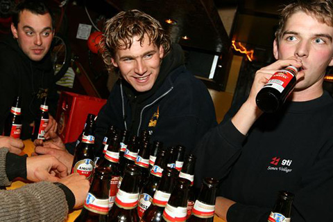 De vrienden waren vijftien toen ze een plek zochten waar ze bij elkaar konden komen. "We waren meestal met zijn twaalven en ouders hebben geen zin in zo'n zooitje ongeregeld in huis", vertelt Arjan, één van de leden van de Sckuit. Ze timmerden een hok bij wijlen boer Karsting op het erf. "Daar kwamen we geregeld samen om te kletsen en wat te klooien. In het begin dronken we nog amper. Dan stond er een ‘sixpackje' bier en dat was na een weekend niet eens op", aldus Arjan. Nu drinken de jongens wel, maar alleen bier. En ja soms wel eens behoorlijk. Hoeveel precies? "Tja, er staan nu vier kratten en die drinken we dan op met zijn zestienen." Omgerekend is dat zes flesjes bier per persoon. Soms is het meer en zijn ze dronken, maar de mannen zijn het er unaniem over eens dat je je van alleen bier niet in een ‘coma zuipt'. Sowieso kennen zij geen jongeren die dat gedaan hebben.
