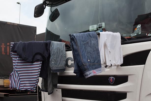 In het Rotterdamse havengebied, weggestopt achter roestige containers, staan enkele tientallen Poolse vrachtwagenchauffeurs langdurig geparkeerd...