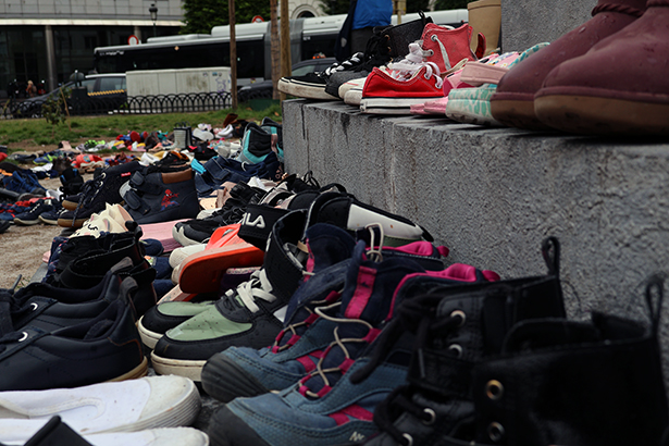 Bij het Europees Parlement in Brussel zijn kinderschoenen neergezet in de vorm van het telefoonnummer...