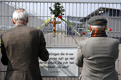 Op Goede Vrijdag hield de Franciscaanse Vredeswacht een wake bij het cellencomplex van Schiphol-Oost.