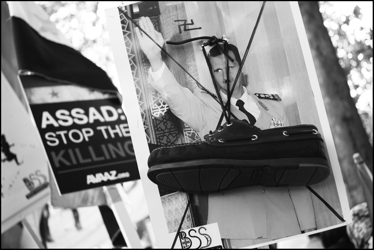 Mensenrechtenactivisten spraken afgelopen zaterdag de menigte toe bij een demonstratie bij de Syrische ambassade in...