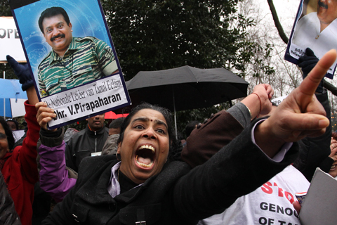 Bij het Internationaal Strafhof in Den Haag hebben zo’n 400 Tamils gedemonstreerd tegen het legeroffensief...
